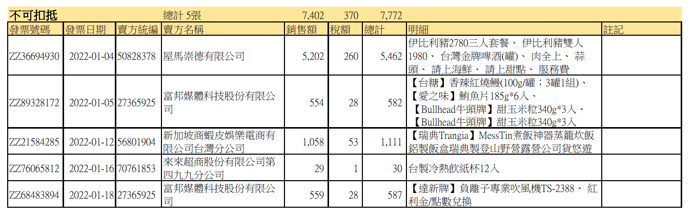 2. 因品名消費性質模糊,可能會有發票被列錯,在不屬於他的不可扣抵/可扣抵表中。