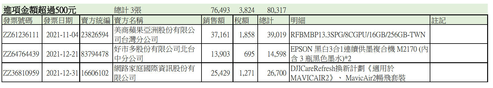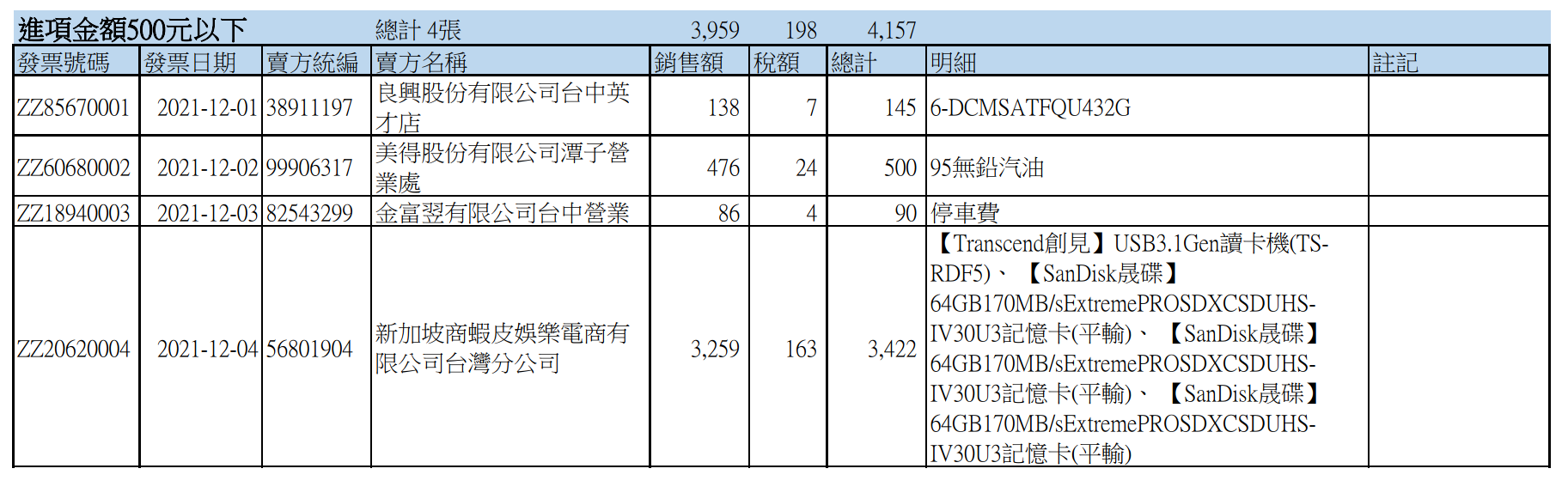 統整表主要欄位有:發票號碼、日期、賣方統編、賣方名稱、銷售額、稅額、總計、品名明細、註記,其中又分成稅額超過500元、500元以下、不可扣抵: