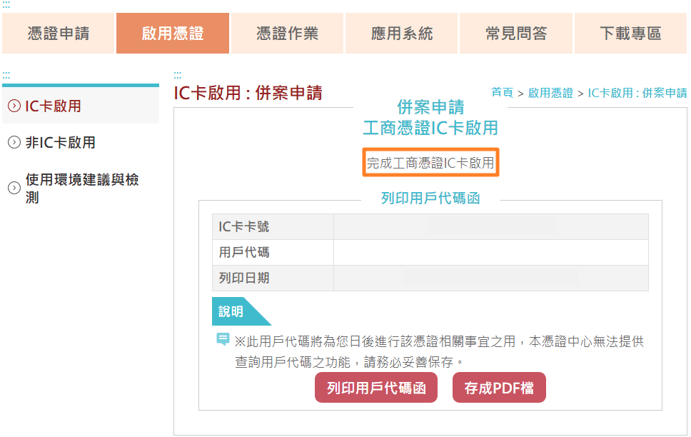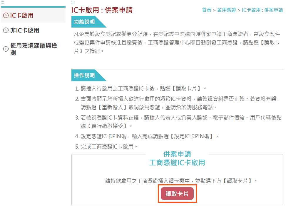 Step 1:進入經濟部工商憑證管理中心->啟用憑證->IC卡啟用
