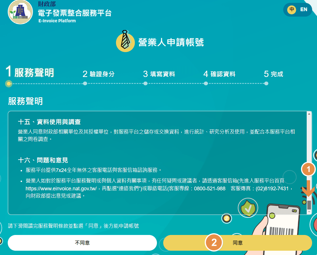 接著會進到聲明畫面,1. 請拉到底  2. 同意