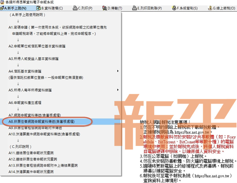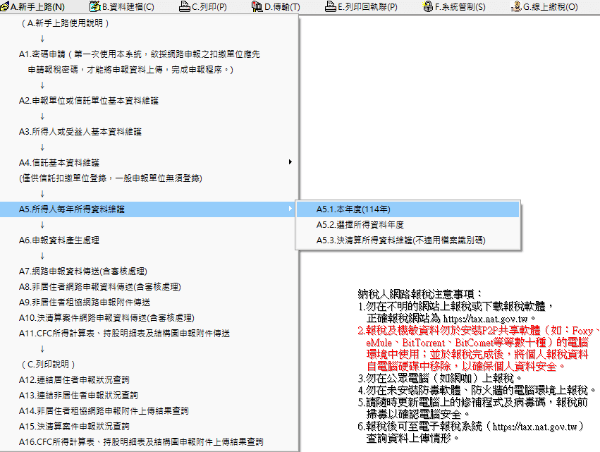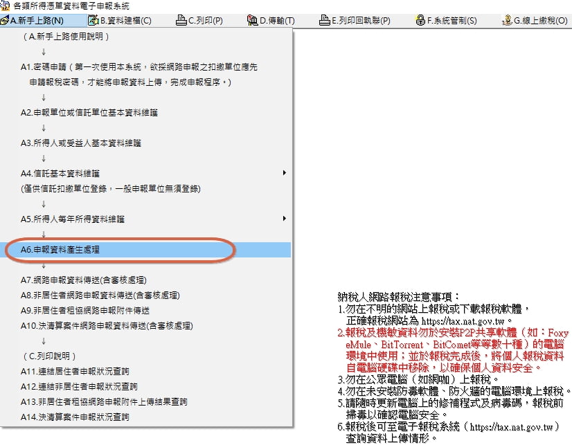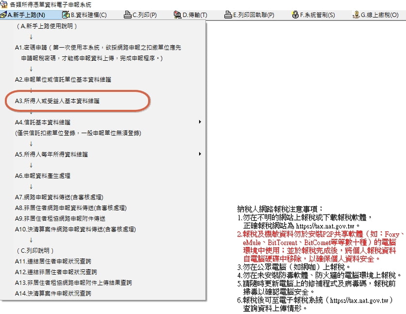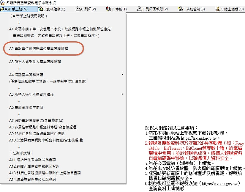 進入申報系統後,在上方欄位點選A.,並選擇A2.。(初次申報、扣繳一定要先進A2.輸入基本資料)
