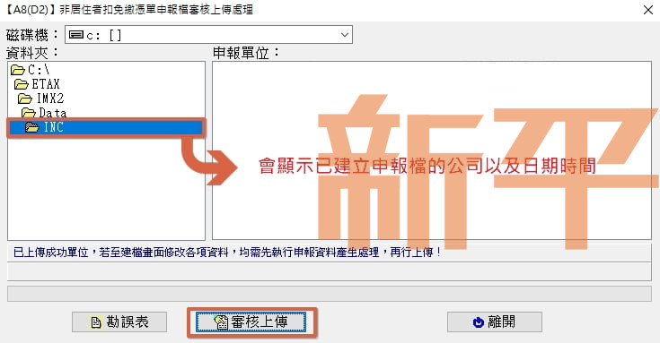 在左側選擇INC的資料夾,右側申報單位會顯示已建立申報檔的公司以及日期時間,選擇完欲申報的檔案後點擊下方「審核上傳」。