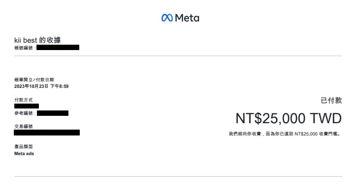 出於商業目的或是為團體/組織購買廣告,在付款時輸入正確的統一編號以利於Meta判斷,付款完成後不會開立發票給您,只會有購買廣告的收據,收到收據後要記得申報扣繳。