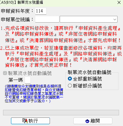 輸入公司統編及名稱,製單流水號選擇全部重新編號,完成後點擊「執行」。