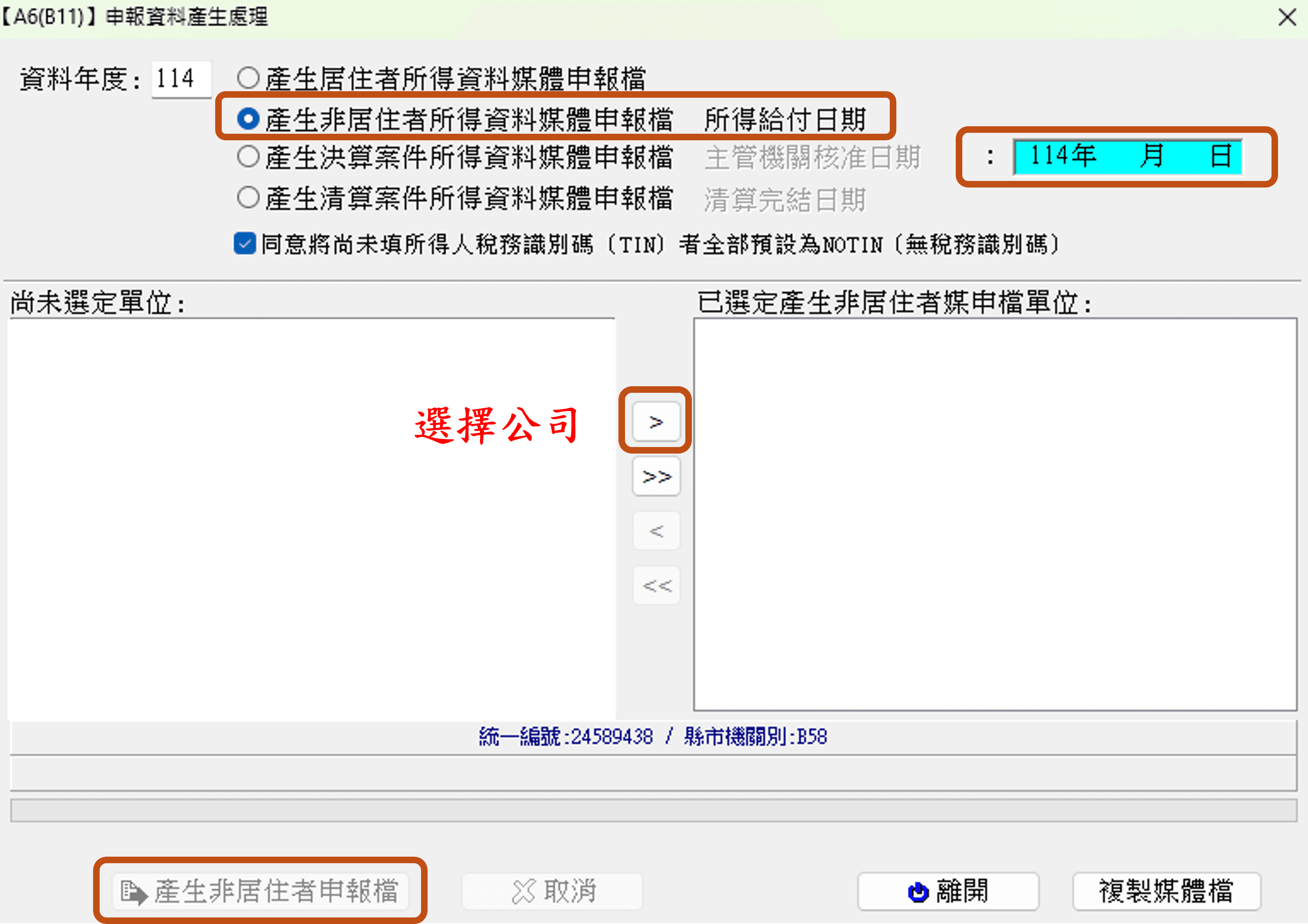 在左邊欄位選取要申報的單位並移至右邊,點擊下方產生非居住者申報檔並確認扣繳義務人及負責人是否正確。