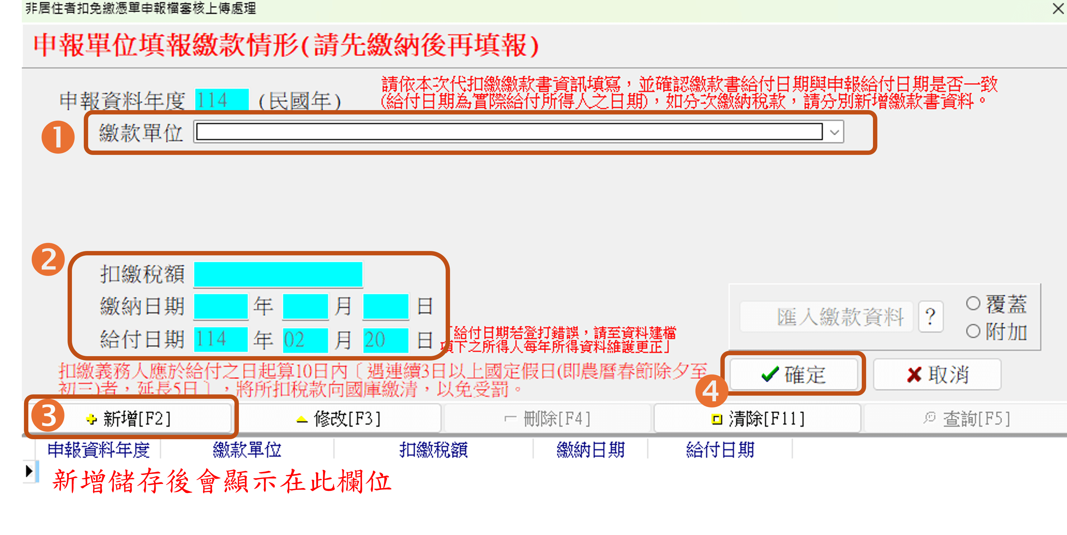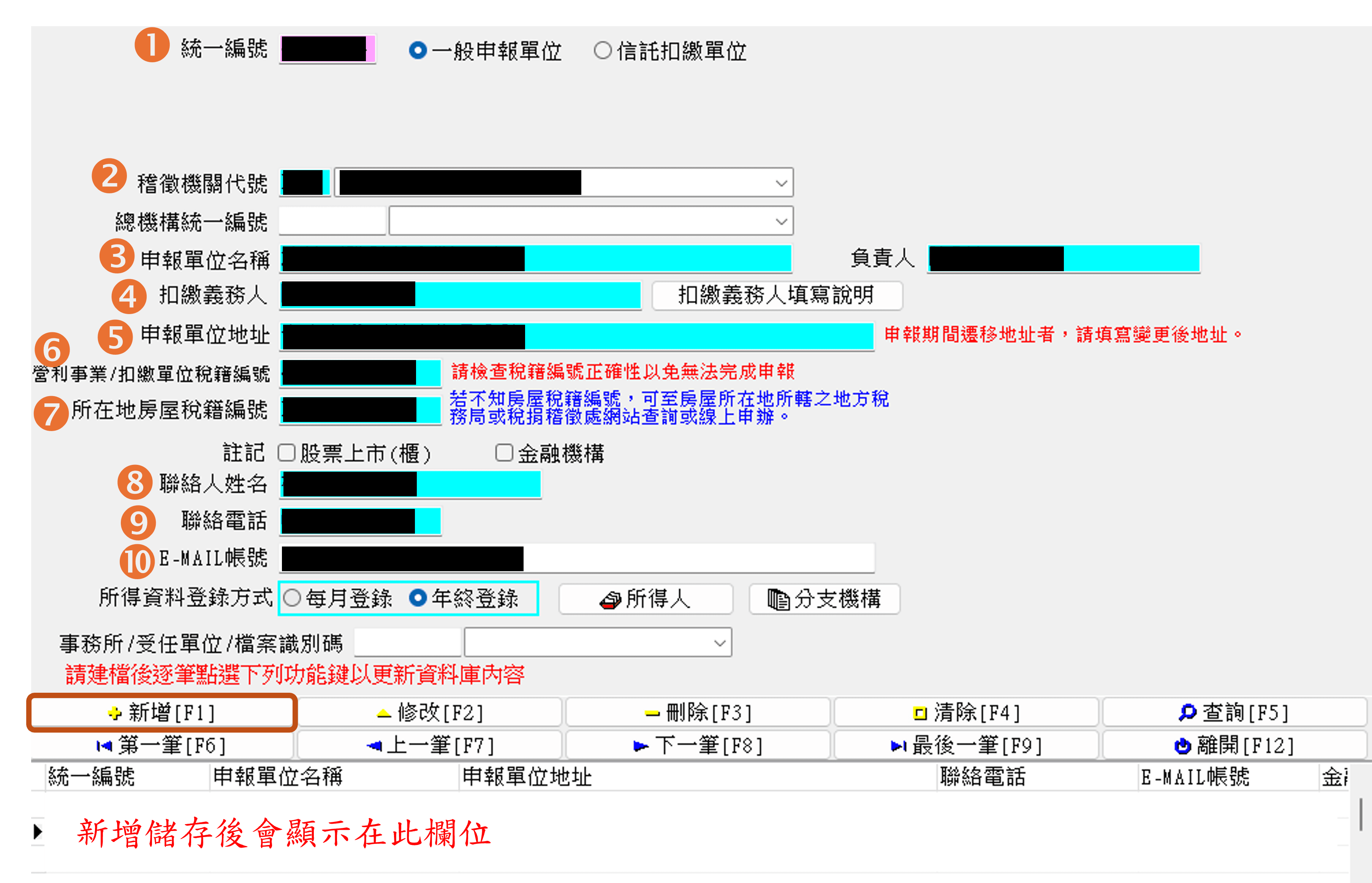 給付總額、淨額、扣繳稅額依實際金額填入,輸入完畢點擊下方新增,當您看到下方欄位顯示公司名稱即建檔成功,最後點擊右下「離開」。