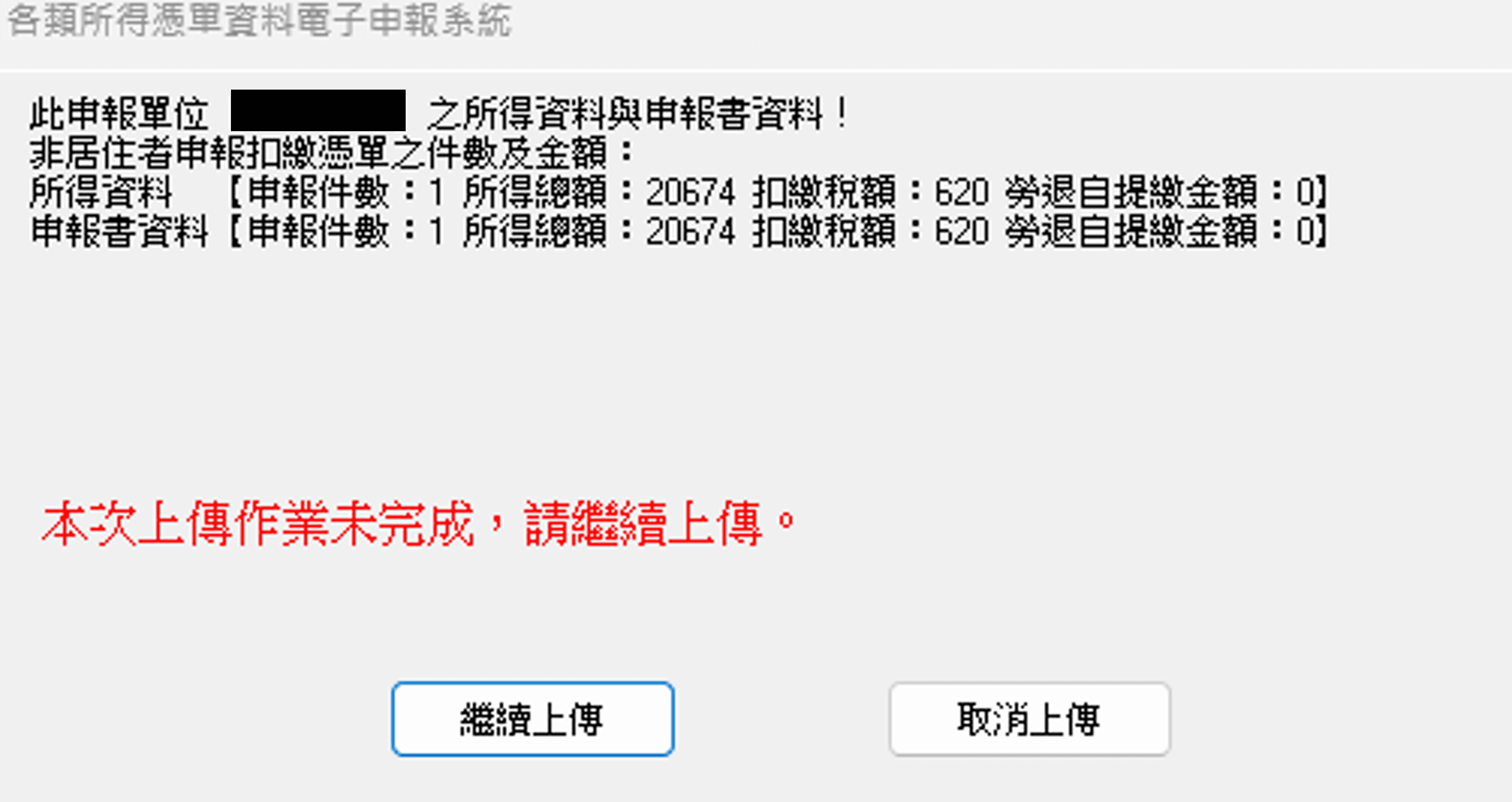 任一種方式繳費完成後,就會跳出下方顯示框,請點擊「繼續上傳」。