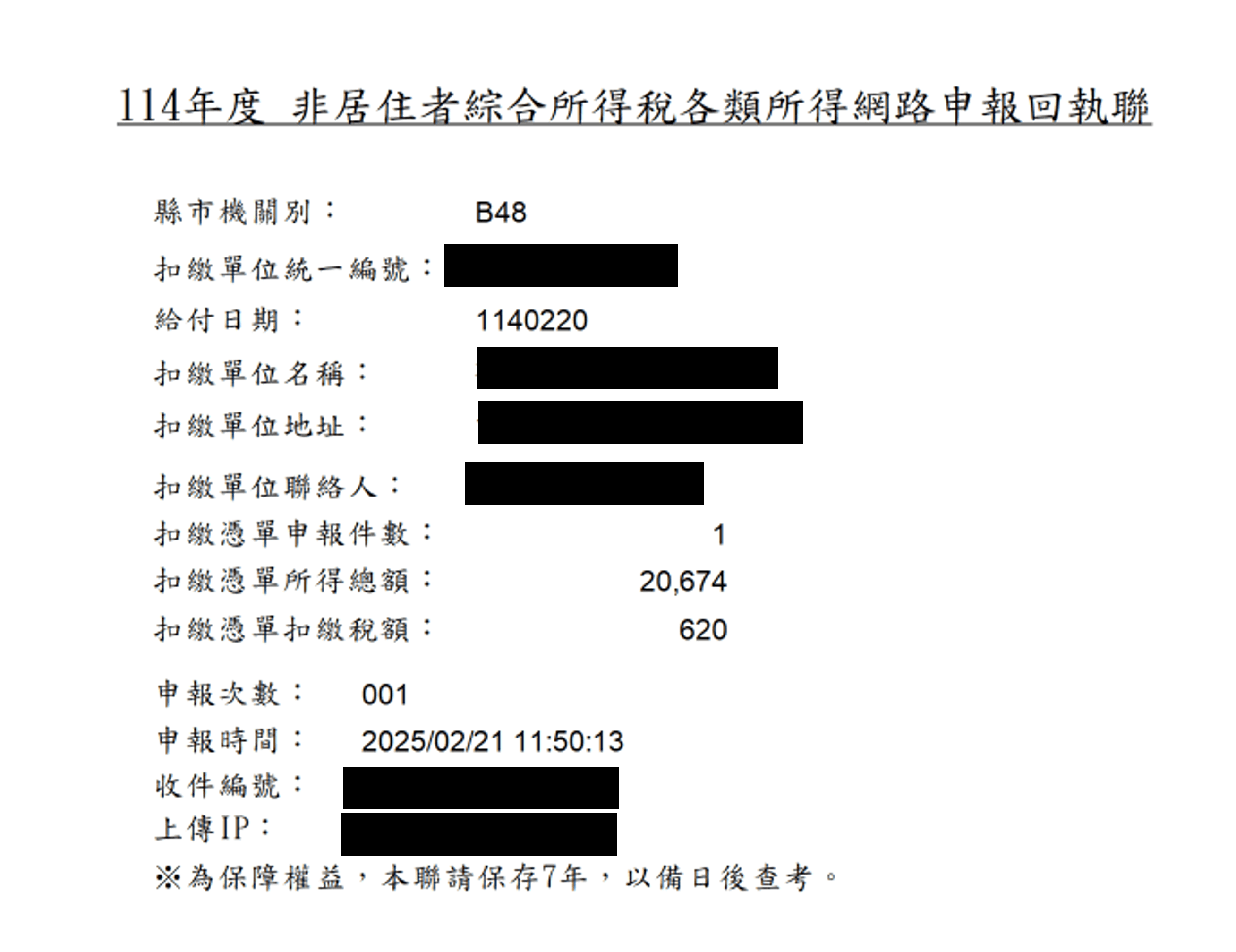 扣繳稅金(3%): 0元 (10日內申報繳納)