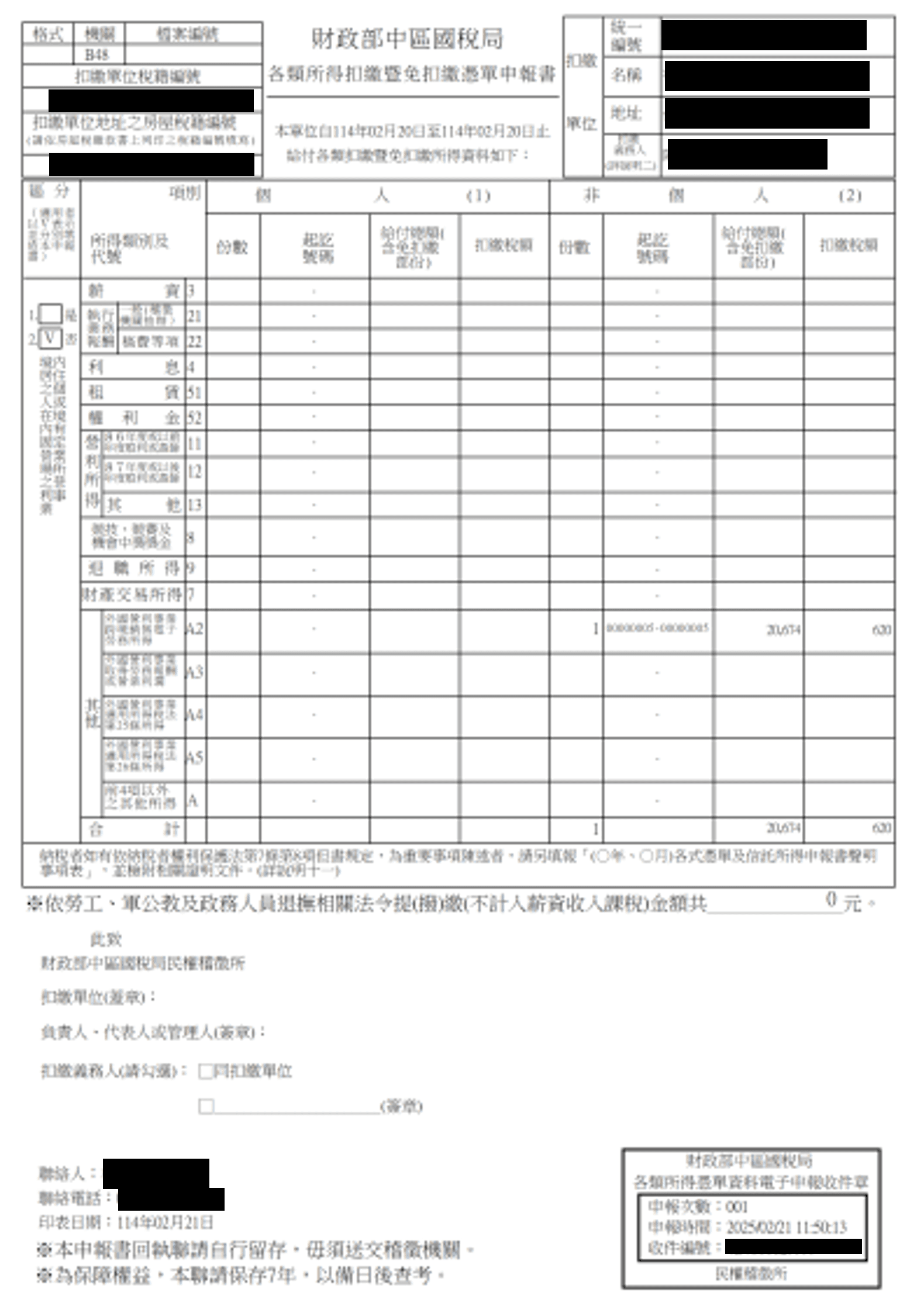 扣繳稅金(6%): 0元 (10日內申報繳納)