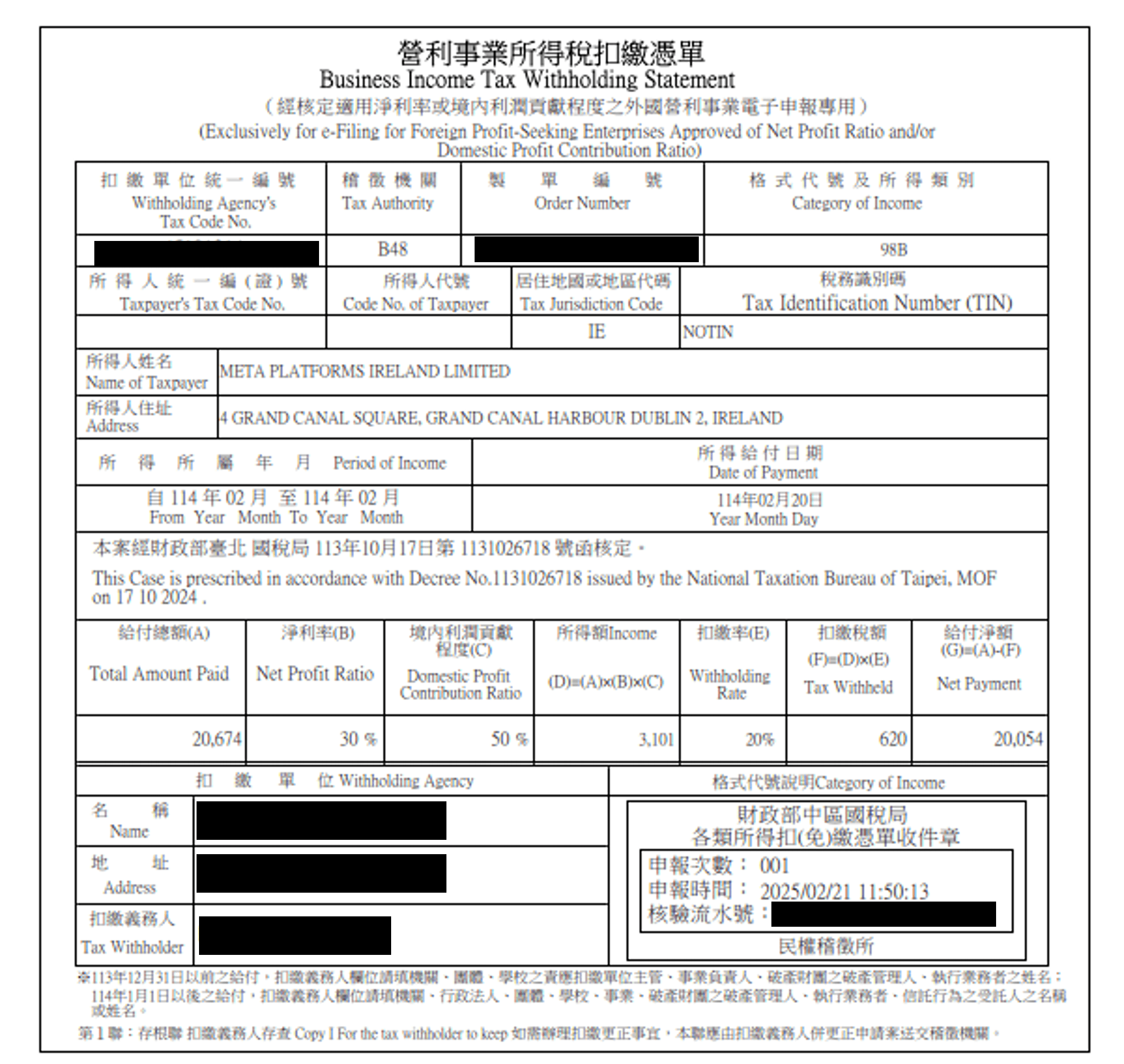 所得單位名稱:Meta Platforms Ireland Limited (Facebook 公司之前有改名為Meta了)