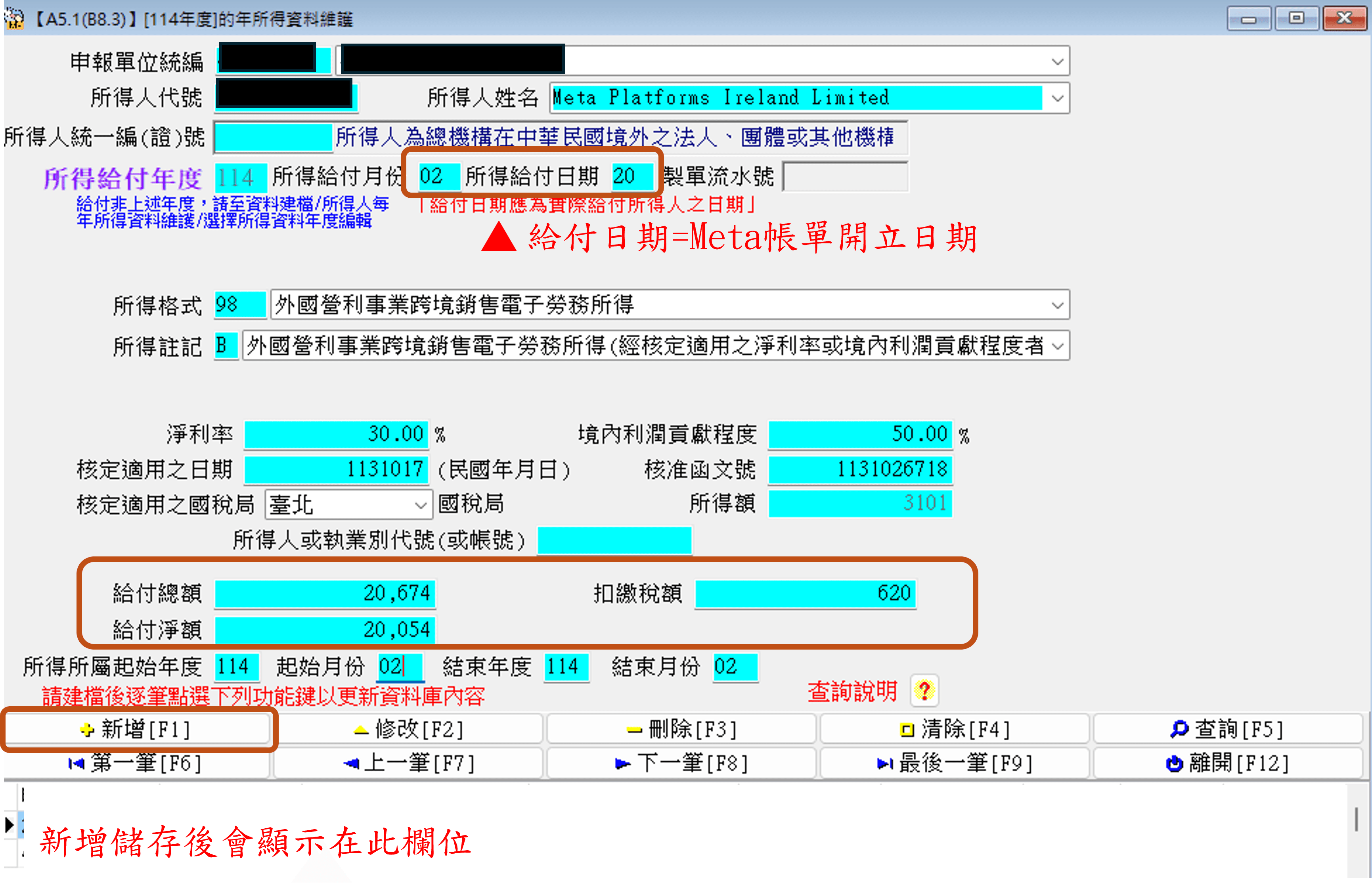 選擇第二項「產生非居住者所得資料媒體申報檔」,給付日期為Meta帳單開立/付款日期。
