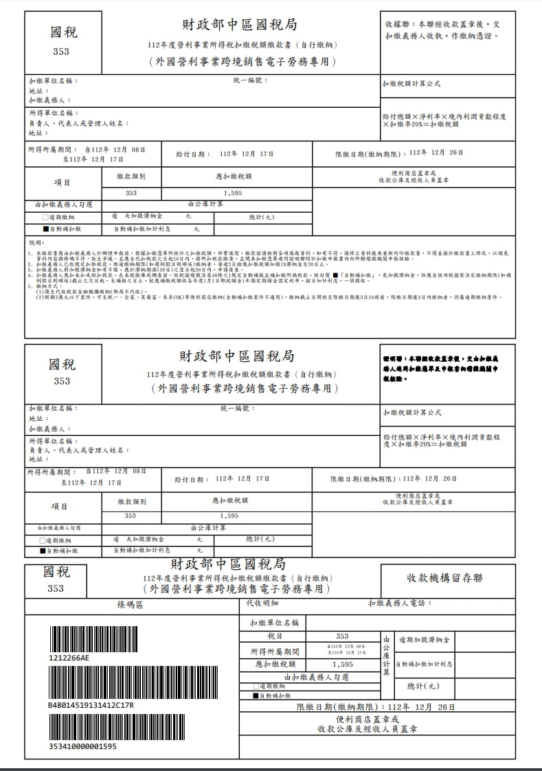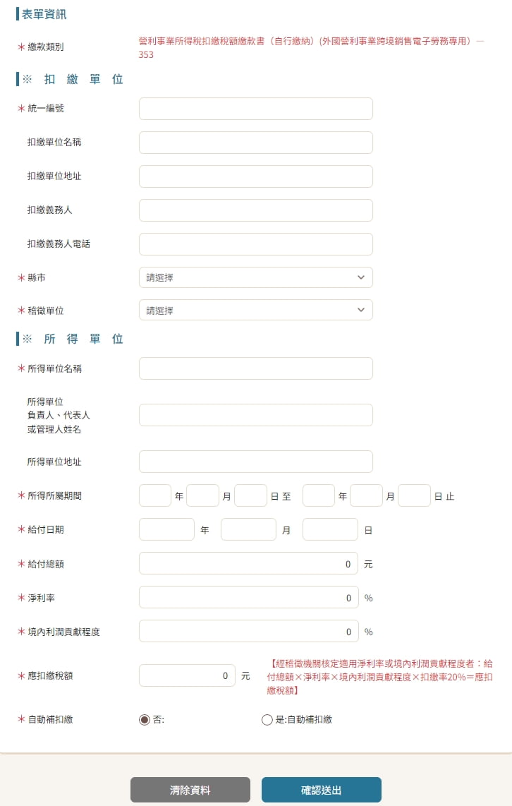 至財政部稅務入口網填寫「營利事業所得稅扣繳稅額繳款書(353)」,扣繳單位部分請依正確資訊填入,所得單位部分可參照下列所示:
